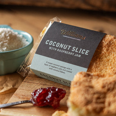 The Coconut Slice from Williams Handbaked is a moist coconut sponge, topped with flaked coconut, with a raspberry jam layer on a pastry base. All o...